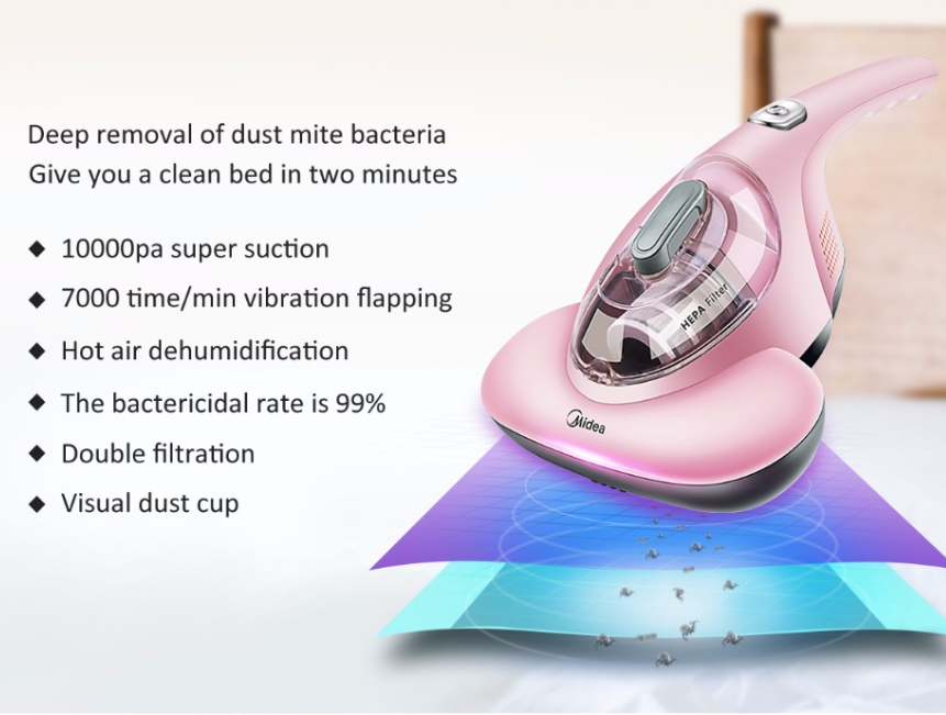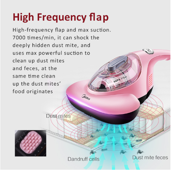 - High-frequency flap and max suction. 7000 times/min, it can shock the deeply hidden dust mite, and uses max powerful suction to cleanupdust mitesand feces, at the same time clean up the dust mites’ food originates
