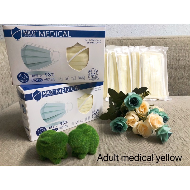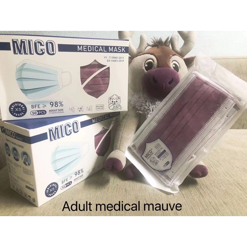 Product detail:- 3ply - 50pcs in a box - 5 packets of 10 mask- Efficient protective meltblown cloth- Comfortable non-woven fabric- Ultrasonic seamless technology- Strong plasticity nose strip- With MICO stamp on mask to prove authenticity - This product complies with the BFE and PFE standards specified by YY/T Surgical mask.