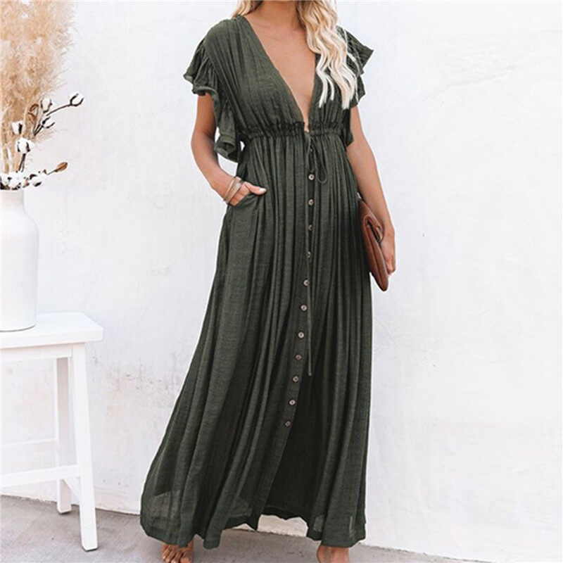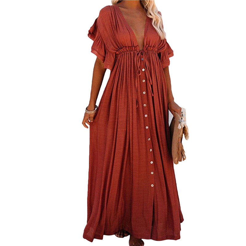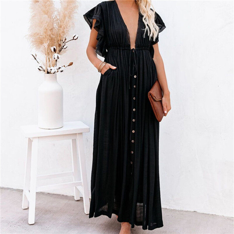 Pick me up ShopWoman Bohemian Boho Fashion Elegant V Neck Bikini Cover-ups Long White Tunic Casual Summer BeachDress Elegant Women BeachWear Swim Suit Cover Up Loose Maxi Pregnant Maternity Dresses Pl