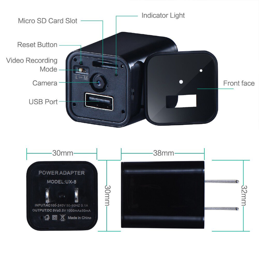 Description:Product name: Wall CameraVideo format: AVIVideo resolution: 1920x1080PVideo frame rate: 30fpsImage ratio: 16:9Charging voltage: DC-5VPlug: EU/US (optional)Packing list:1 x Wall Charger Camera1 x ManualNote:1. Due to manual measurement, please allow 1-3cm error. Make sure you don't mind before bidding.2. Due to the difference of different monitors, the picture may not reflect the actual color of the product. Thanks.