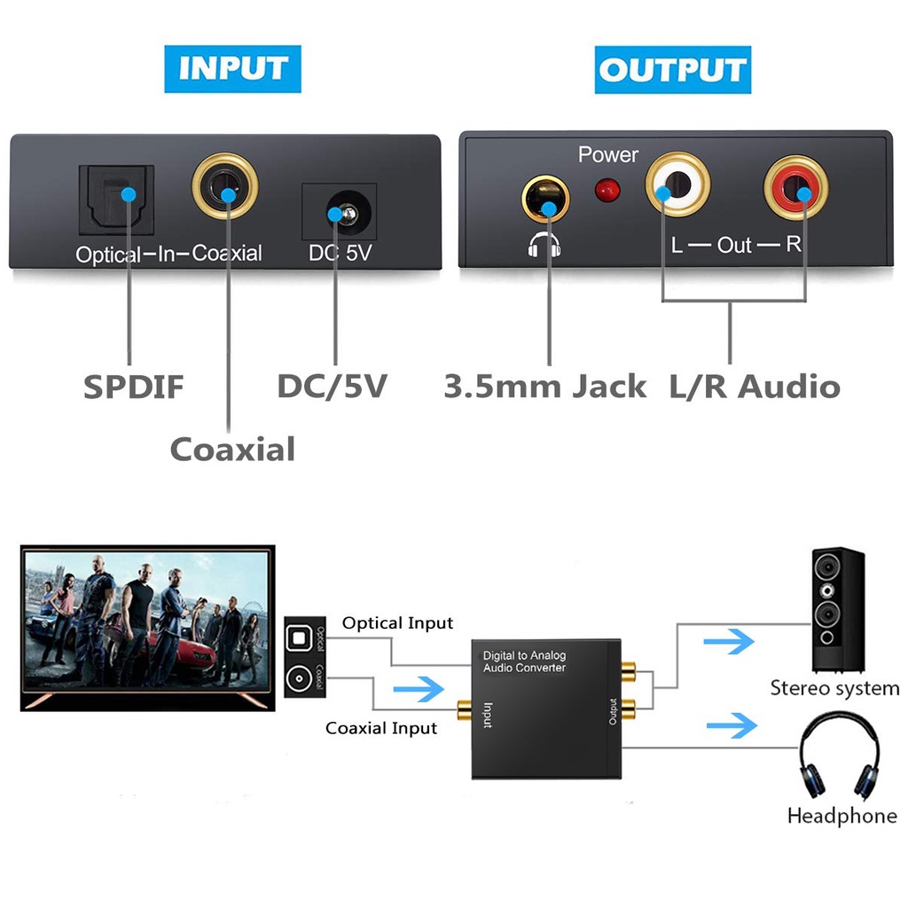 - Converts coaxial or toslink digital audio signals to analog L/R audio.