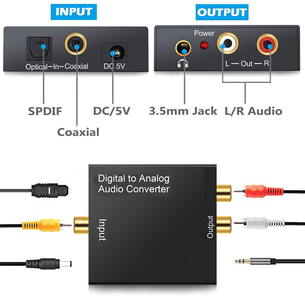 - Converts coaxial or toslink digital audio signals to analog L/R audio and connects to an external device such as an amplifier via standard RCA jacks