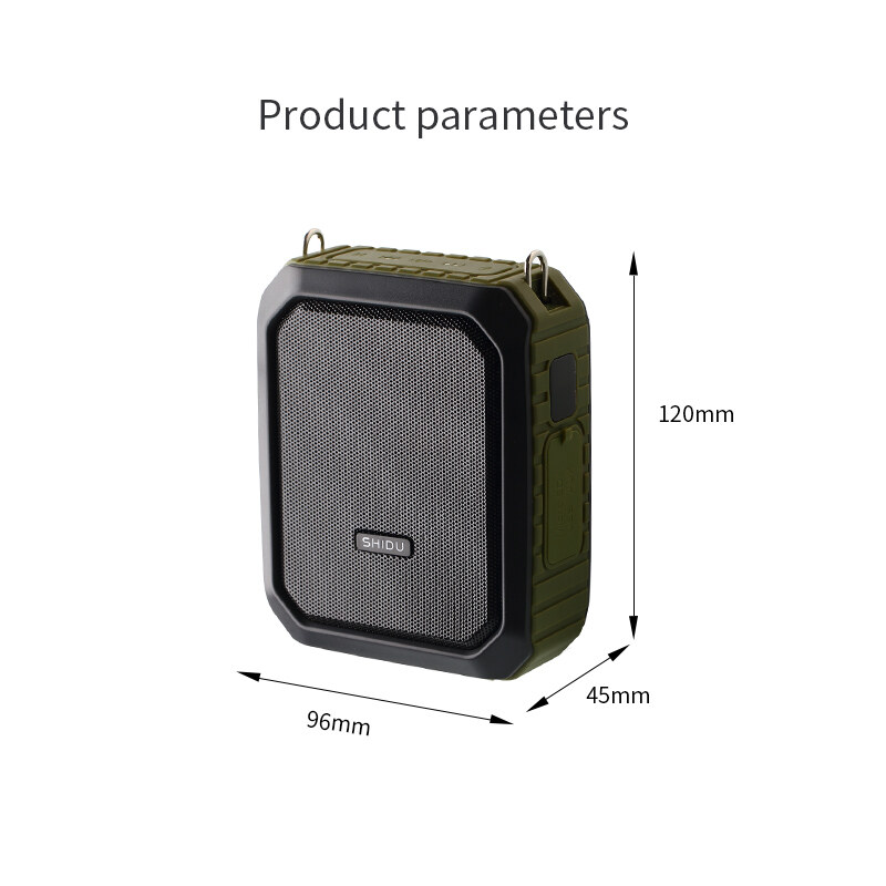 Specifications:1. Output Power: 18W2. Charging Voltage: DC 5V3. Lithium Battery:3.7V/2200mAh*2pcs4. Working Time:With 50% Volume8~10Hours (musical mode);10~15 Hours (MIC mode)5. Charging Time: 3~5 hours6. Product Size: 120*96*45mm7. Unit Weight: 392g8. Available Color: Green; Black9. Working Temperature: -10℃~45℃10. Frequency Response: 90Hz~18KHz11. Wireless Distance:30-35m