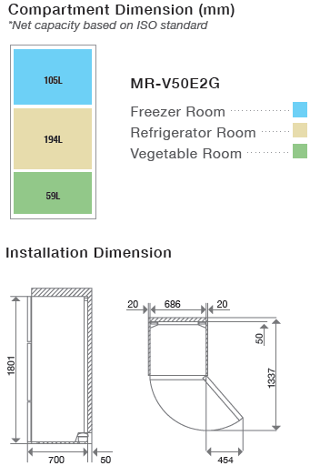 MITSUBISHI MR-V50E2G 358L STAINLESS STEEL 3 DOOR TOP FREEZER REFRIGERATOR